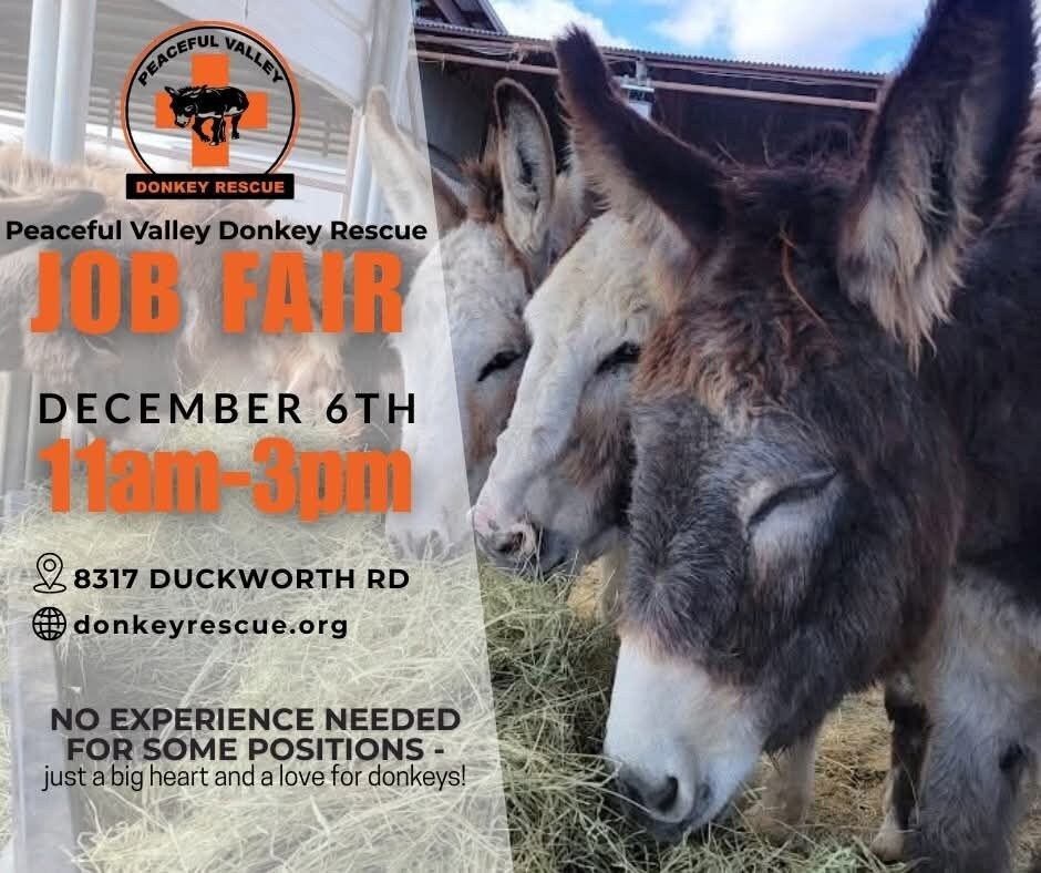 Join us at Peaceful Valley Donkey Rescue for an on-site job fair on Saturday, December 6, from 11:00 AM to 3:00 PM. PVDR is hiring career-minded individuals who love animals, adventure, and hands-on work. Staff will be available to answer questions, and refreshments will be provided.